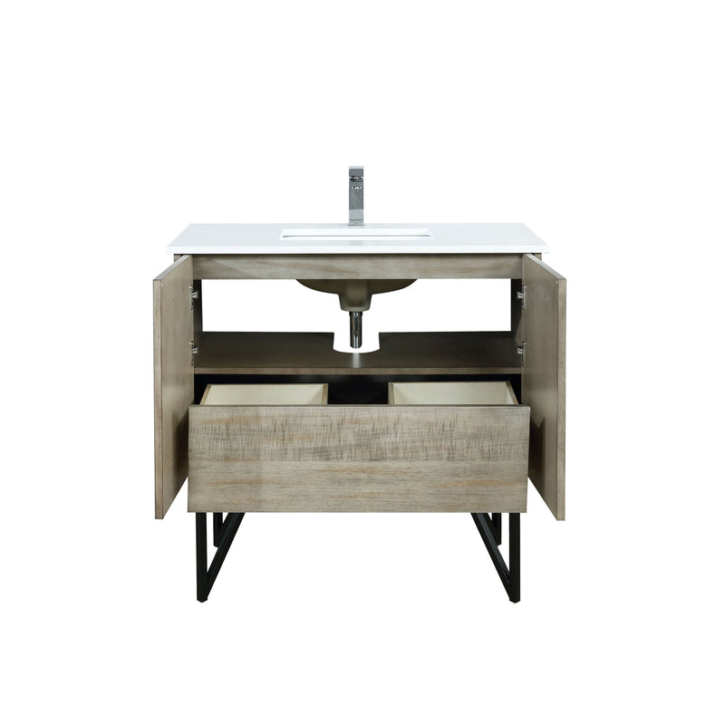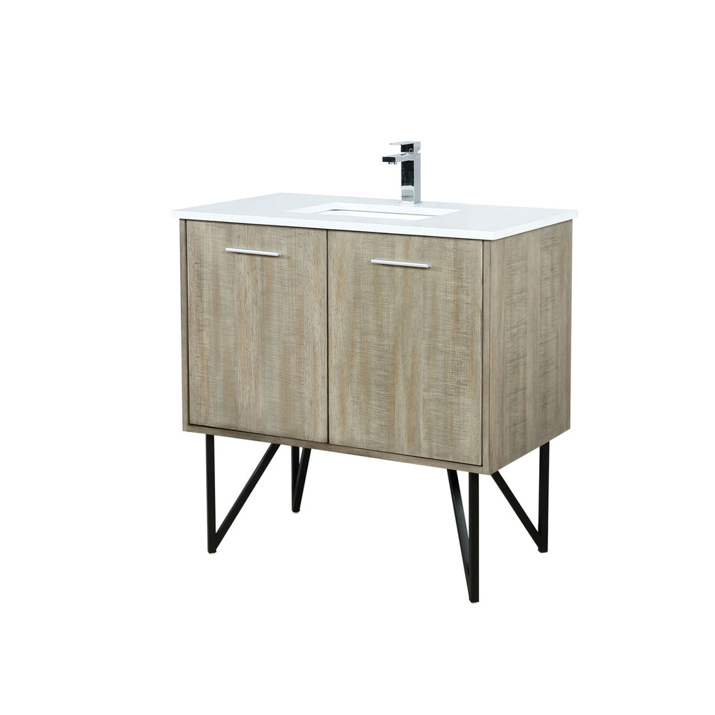 Lexora Lancy 36" Rustic Acacia Bathroom Vanity, White Quartz Top, White Square Sink, and Labaro Brushed Nickel Faucet Set LLC36SKSOS000FBN