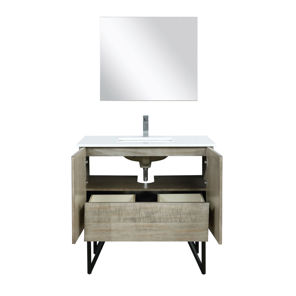 Lexora Lancy 36" Rustic Acacia Bathroom Vanity, White Quartz Top, White Square Sink, Balzani Gun Metal Faucet Set, and 28" Frameless Mirror LLC36SKSOSM28FGM