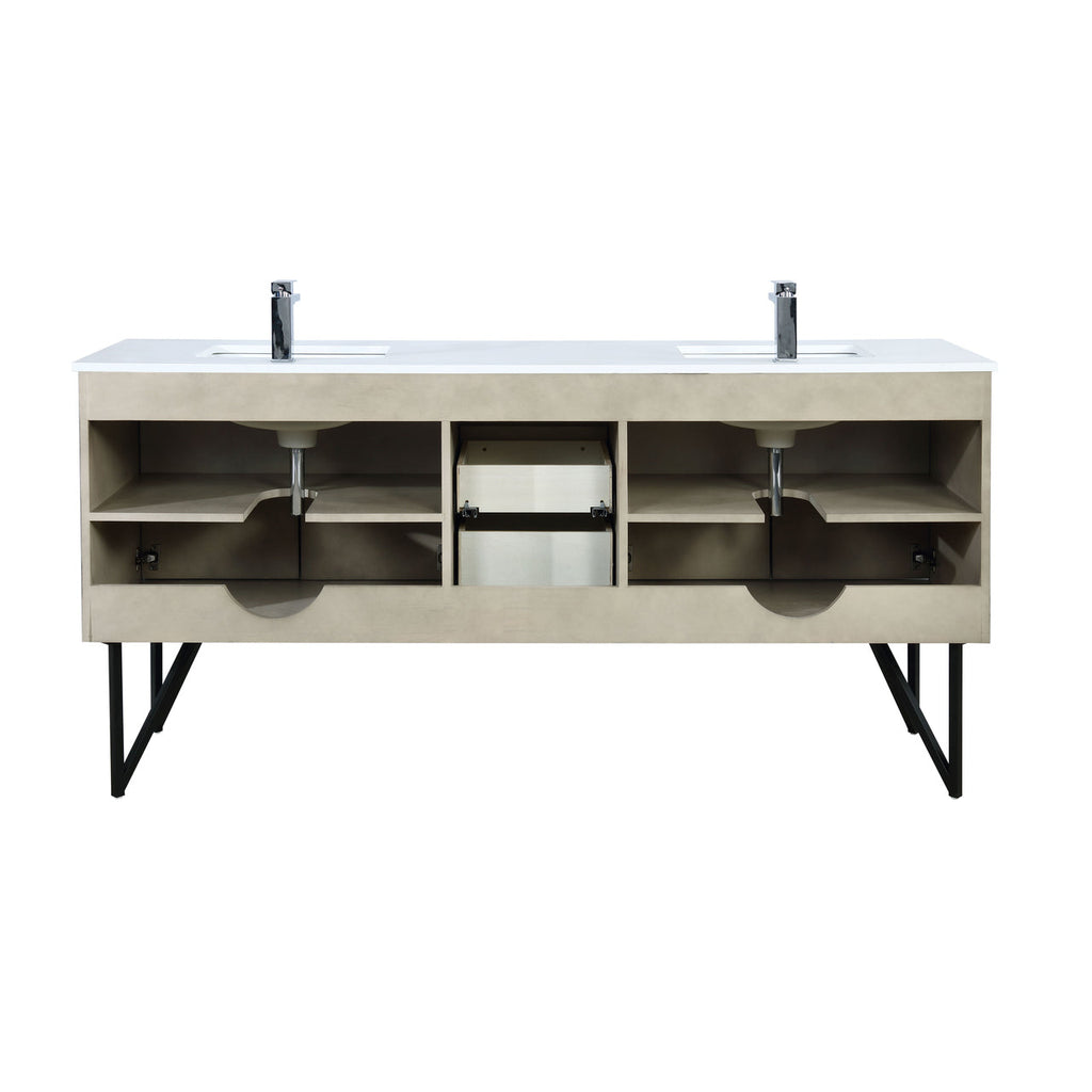 Lexora  Lancy 72" Rustic Acacia Double Bathroom Vanity, White Quartz Top, White Square Sinks, Labaro Brushed Nickel Faucet Set, and 70" Frameless Mirror LLC72DKSOSM70FBN