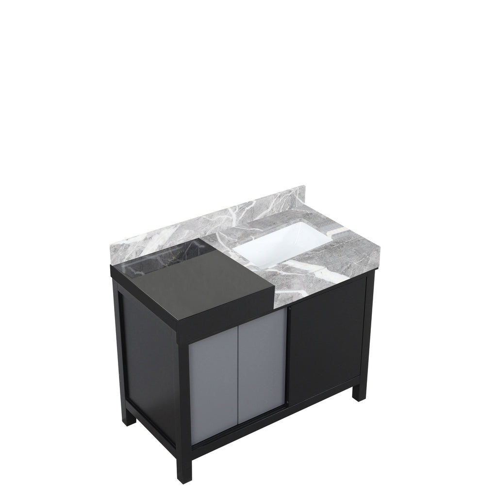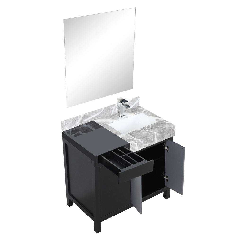 Lexora Zilara 36" Black and Grey Vanity, Castle Grey Marble Top, White Square Sink, Balzani Gun Metal Faucet Set, and 30" Frameless Mirror - LZ342236SLISM30FBG