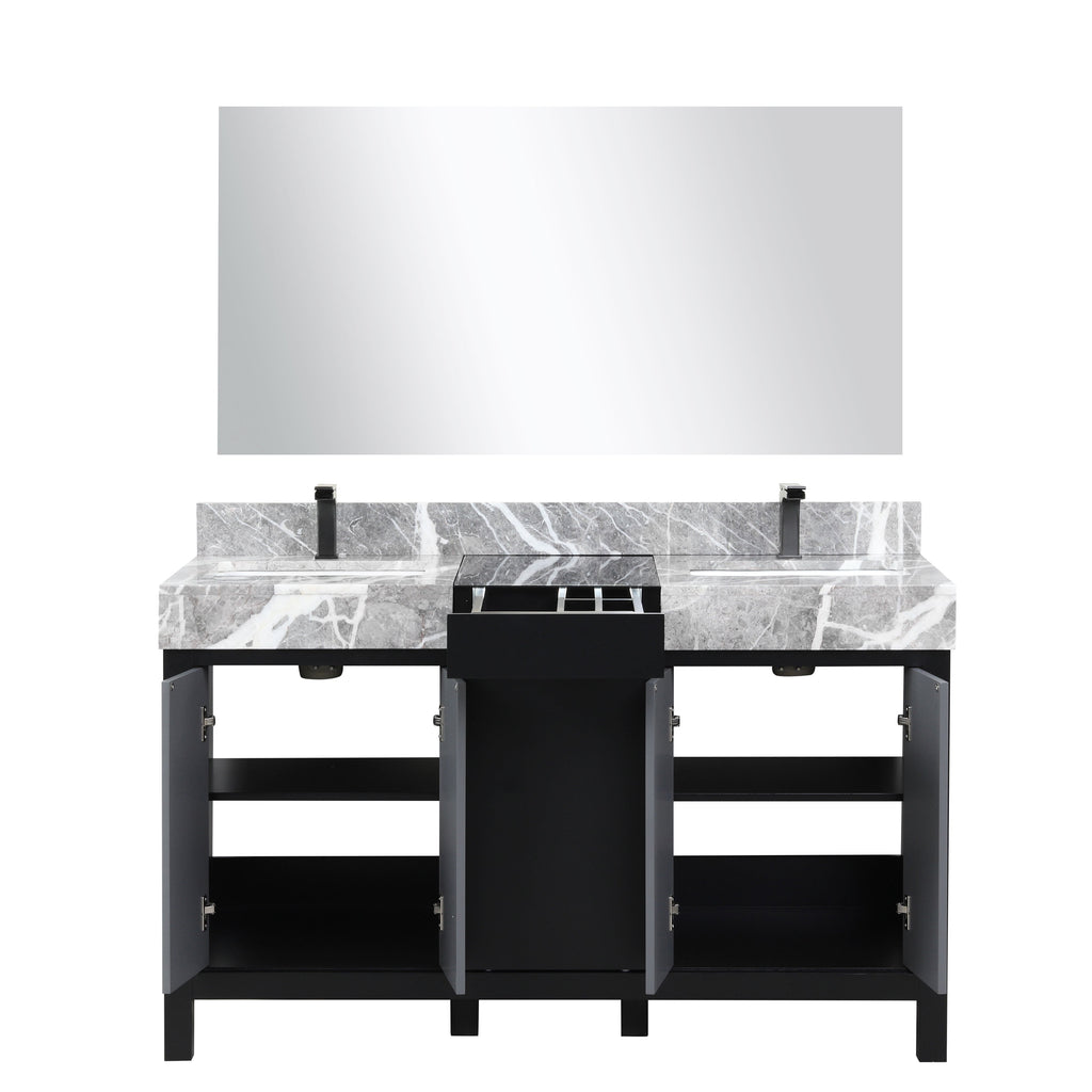 Lexora Zilara 55" Black and Grey Double Vanity, Castle Grey Marble Tops, White Square Sinks, Balzani Gun Metal Faucet Sets, and 53" Frameless Mirror - LZ342255SLISM53FBG