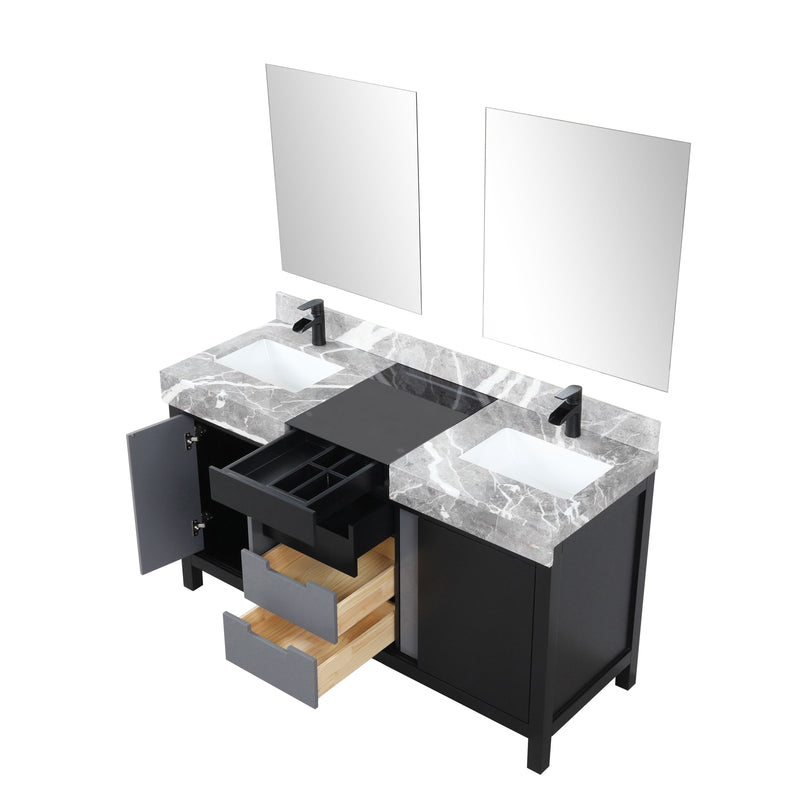 Lexora Zilara 60" Black and Grey Double Vanity, Castle Grey Marble Tops, White Square Sinks, Balzani Gun Metal Faucet Set, and 28" Frameless Mirrors - LZ342260DLISM28FBG