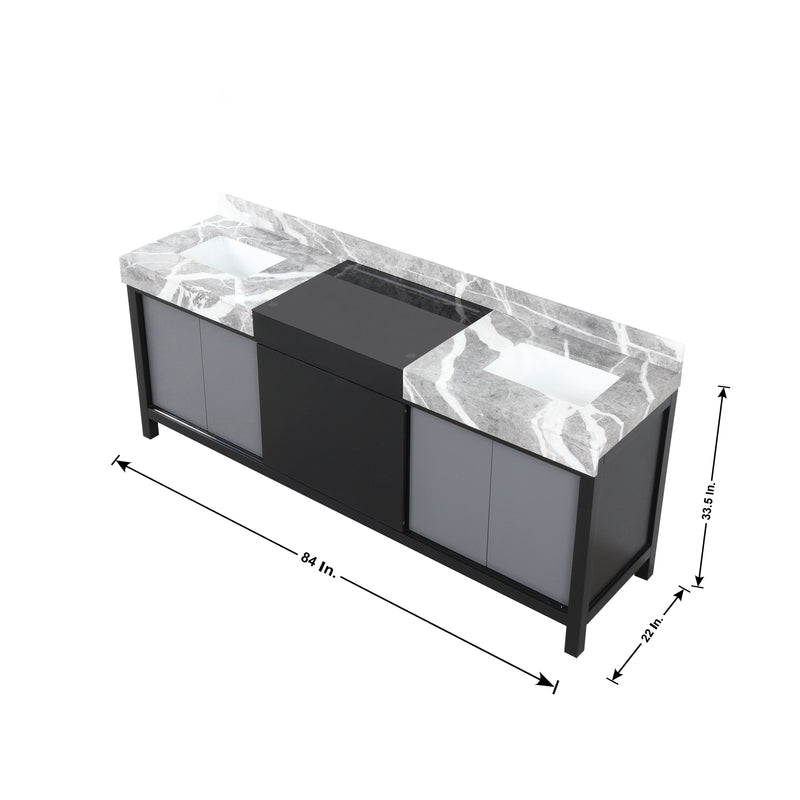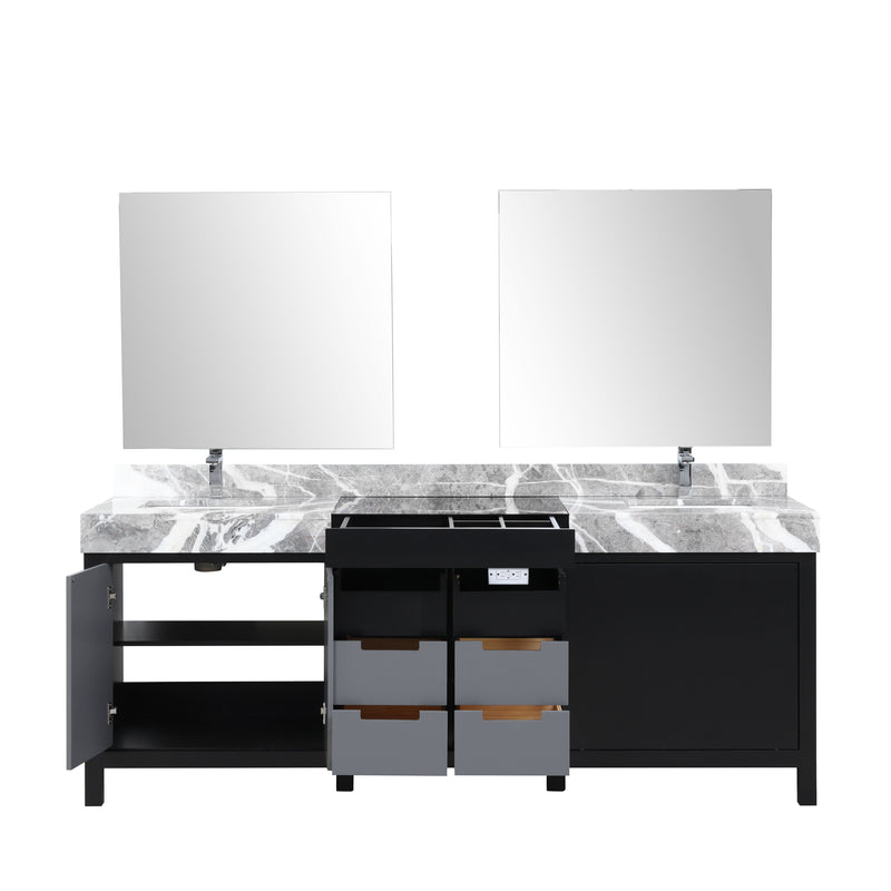 Lexora Zilara 84" Black and Grey Double Vanity, Castle Grey Marble Tops, White Square Sinks, Monte Chrome Faucet Set, and 34" Frameless Mirrors - LZ342284DLISM34FBG