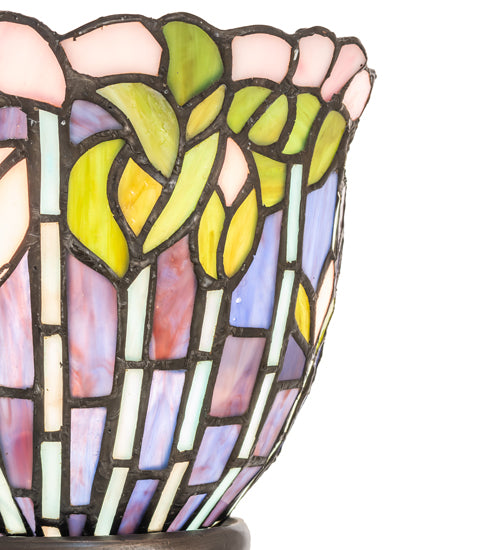 Recreating Tiffany Studios' highly sought-after Flowering Lotus lamp; one of the world's foremost art glass designs This exquisite mini lamp features a shade crafted using quality hand-rolled art glass and the same high quality Meyda Lighting Tiffany copperfoil technique. Leafy Green and Pink petals highlight the multiple stems in blossom; this shade recaptures the artistry and craftsmanship perfected by Tiffany in his original creations. Traditionally elegant; classically styled; and made to the highest quality standards; this lamp will add character to any room.