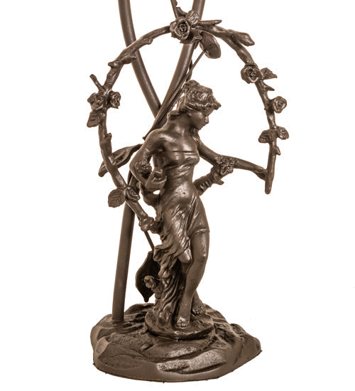Inspired by Tiffany's famous Pond Lily design from the early 1900s... This table lamp features two stunning Amber and Green stained glass shades created using the famous Meyda Lighting Tiffany copperfoil construction process. The two Pond Lily shades are embraced by an elegant Cast Bronze Base featuring a girl under a trellis and finished in a rich Mahogany patina.