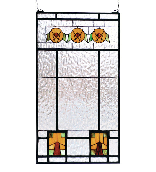 Arts and Crafts inspired Dogwood trees and flowers of Bark Brown, Amber Honey and Woodland Green accent the Clear Flemish textured glass window. This handsome American style Meyda Tiffany window is made from 106 pieces of hand cut stained glass and handcrafted utilizing the copperfoil construction process. The window also comes with a solid brass hanging chain and brackets.