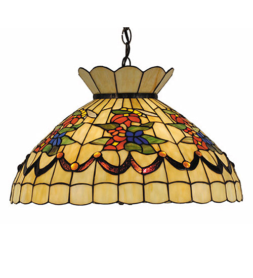 A curious Bumble Bee is highlighted on Yellow art glass with Clear Iridescent Glass Wings across a spray of colorful flowers in Wedgewood Blue, Yellow Orange art glass. A Nouveau styled garland is featured in Purple/Blue and Green/Brown with Purple jewel buttons glass. The pendant is complemented with a Mahogany Bronze finish. The shade is created using the famous Meyda Tiffany copperfoil construction process. The Bumble Bee Pendant is featured in our American designed, handcrafted Tiffany Style Stained Glass Lighting Collection. UL and cUL listed for dry and damp locations.