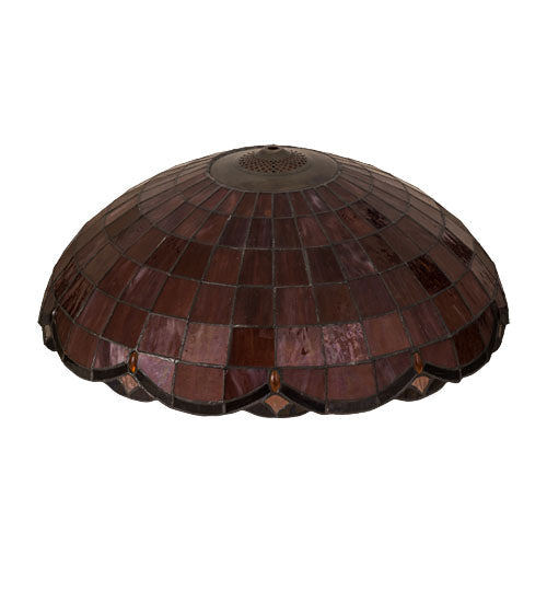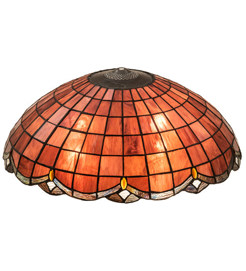 Elan features a Plum/Raspberry art glass shade trimmed in swooping scallops of Amethyst Ripple glass hues, which are accented by sparkling Amber and Clear jewels. The shade is created using the famous Meyda Tiffany copperfoil construction process. Pairs beautifully with a base to create a stunning table or floor lamp. Match with hardware to build a gorgeous ceiling or wall fixture. The Elan Shade is featured in our American designed, handcrafted Stained Glass Lighting Collection. Each shade is a unique work of art with color variations based on natural ingredients inherent in the glass. Contact us if color matching is critical when ordering multiple items.