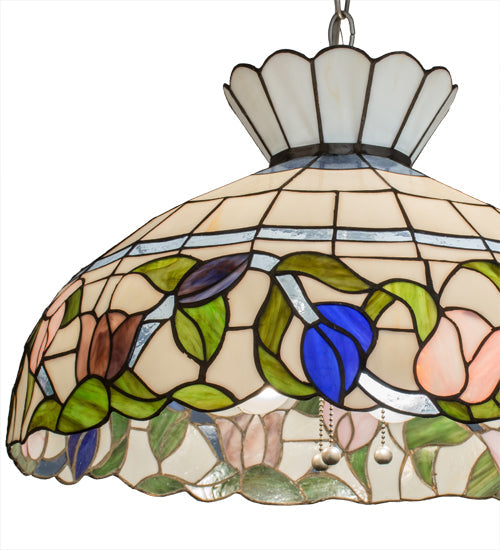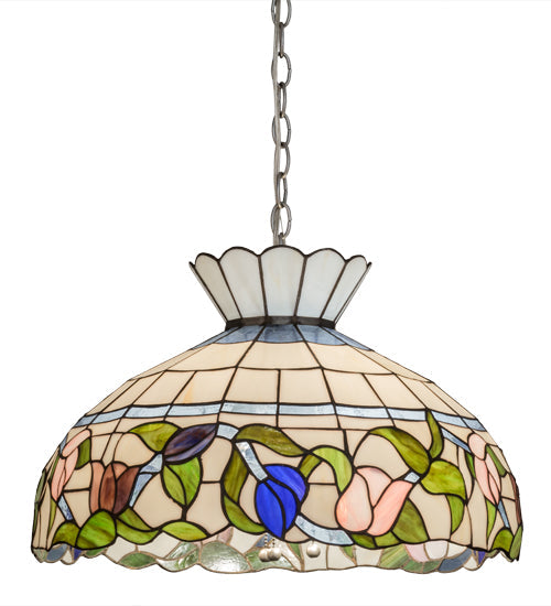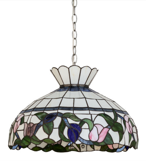 Pink, Blue, Purple and Magenta colored flowers are displayed on Blue colored Waterglass vines and accents, which complement an underbrush of Spring Green leaves. The art glass shade, which features an Iridescent White art glass background and crown, is created with Meyda Tiffany?s famous copperfoil construction process. The shade is complemented with Mahogany Bronze finished hardware. Custom colors, sizes and finishes are available, as well as dimmable energy efficient lamping options. The pendant is UL and cUL listed for damp and dry locations.