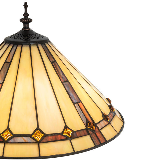 Exquisite Purple and Sunburst colored trim with Amber jewels adorns Beige Iridescent glass on this conical lamp shade. This stunning shade is constructed with the famous Meyda Lighting Tiffany copperfoil construction process and is enhanced with a warm Mahogany Bronze finish.