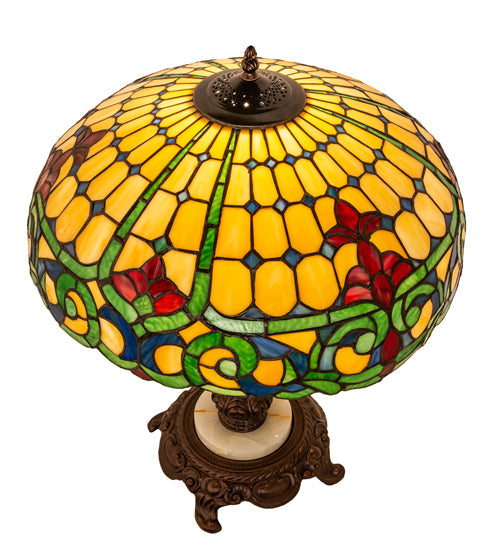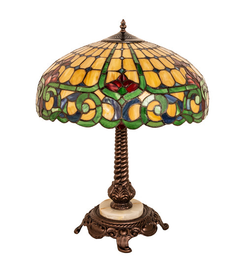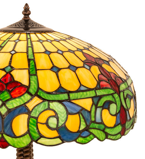 Flourishes of Burgundy colored stained glass accent the Kelly Green scrolls and Sea Blue scrolled motifs on a warm Beige background. The handcrafted shade is created using the famous Meyda Lighting Tiffany copperfoil construction and perched on a hand finished cast metal lamp base in a Mahogany Bronze.
