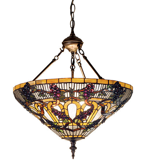 Bring sunny vineyards to your own home or business with this lovely Meyda Original pendant. Radiant Concord Purple jewels, Vineyard Green leaves and glistening dew kissed Bark Brown vines wrap around a Golden Sunshine banded shade. The inverted art glass shade is created using the famous Meyda Tiffany copperfoil construction process. The fixture is enhanced with an Oil Rubbed Bronze finish. Overall height ranges from 30.5 to 65.5 inches as the chain can be easily adjusted in the field to meet your needs. UL and cUL listed for dry and damp locations. Each shade is a unique work of art with color variations based on natural ingredients inherent in the glass. Contact us if color matching is critical when ordering multiple items.
