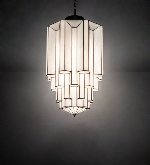 Designed with the glitz and glam of old fashioned movie theaters. Paramount evokes a romantic allusion with a dramatic lighting design that features a White Opal Glass diffuser created using the famous Meyda Tiffany famous copperfoil construction. Multi layers and levels of enclosed glass towers create an extraordinary dimensional effect. The pendant features Blackened Brass. The overall height ranges from 48 to 78 inches as the chain length can be easily adjusted in the field to accommodate your specific lighting needs. Handcrafted in our 180,000 square foot manufacturing facility in Yorkville, New York. Diffuser colors, metal finishes and fixture sizes can be customized to your needs. UL and cUL listed for dry and damp locations.
