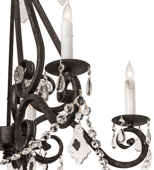 Offering a luxurious charm and elegance. Adrianna features an elaborate design with scrolled steel arms and accents in a stunning Smoke finish. The exquisite chandelier reveals 5 White faux candlelights perched on bobeches and adorned with crystal droplets, medallions and garland.