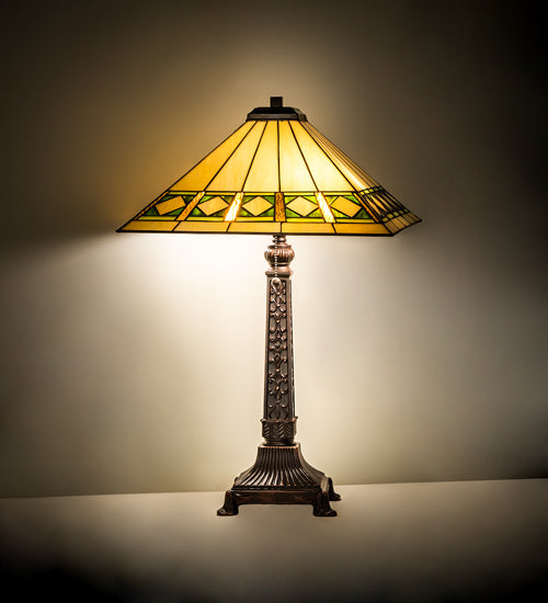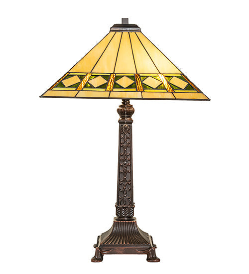 Simple clean lines and geometric shapes are the hallmark of the Mission style. This sleek table lamp features a Bisque Beige stained glass shade highlighted with a simple; elegant diamond pattern in Beige and accented with Amber; Jade and Peridot borders. The shade is created with the famous Meyda Lighting Tiffany copperfoil construction technique and embraced by an elegant cast metal Mahogany Bronze base.