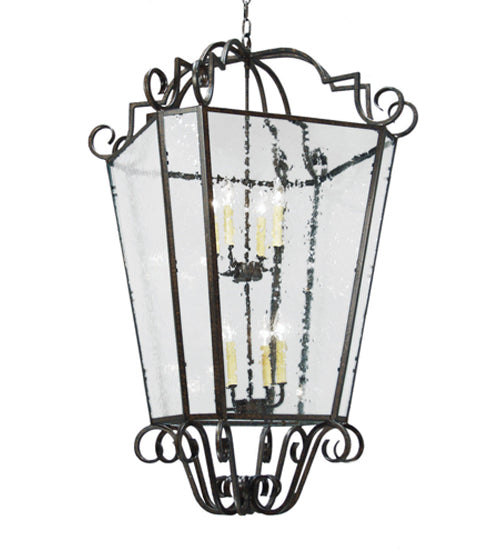 An exquisite pendant for a variety of home, hospitality and commercial settings, the Clear Seeded Glass lens reveals two Ivory 4-light faux candelabras for brilliant ambient illumination. Antique Iron Gate finished scrollwork with matching frame and hardware provide a graceful elegant look and attention to detail. The decorative fixture, which is perfect to welcome guests as a foyer or entryway luminaire or a centerpiece in any room, is custom crafted by artisans using time-honored craftsmanship in Upstate New York in the USA. Dimmable energy efficient lamping options such as LED, as well as custom sizes, styles and colors, are available. The 28-inch lantern is UL and cUL listed for damp and dry locations.