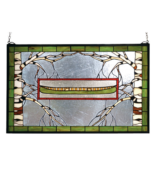 Bare branched Tan and White Birch trees frame a Meadow green canoe with Wheat Beige interior. The frame and inset frame are bordered in a Rust streaked Meadow Green and the background glass is an icy Clear. The Meyda Tiffany Original window is framed in solid brass and has brass mounting bracket and chains included.