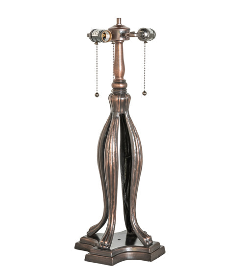This Tiffany Reproduction features undulating lines and Lotus Leaf designs that are reminiscent of its namesake.The classic lamp design features Golden Sun drenched art glass in hues of Emerald, Garnet, Cobalt and Sapphire using Meyda Tiffany's famous copperfoil construction process.The stunning shade is complemented with a table base featured in a warm Mahogany Bronze finish.Custom options include a variety of sizes, styles, colors and dimmable energy efficient lamping. The fixture is UL and CUL listed for dry locations.