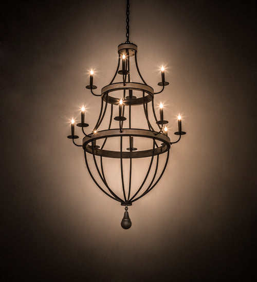A magnificent show of luxury in light, the impressive Georgetown Chandelier embodies two rings and a hub highlighted with Silver Sand finished bands, as well as a matching pear shaped finial. The extraordinary frame and hardware are featured in a Black finish. The top tier displays four complementary faux candlelights while the lower tier features 8 faux candlelights, a total of 12 in a complementary hue to match the bobeches and arms. Handcrafted in the USA, this chandelier is available in custom sizes, finishes and styles. Dimmable energy efficient lamping options such as LED are available. This grandiose fixture is UL and cUL listed for dry and damp locations.