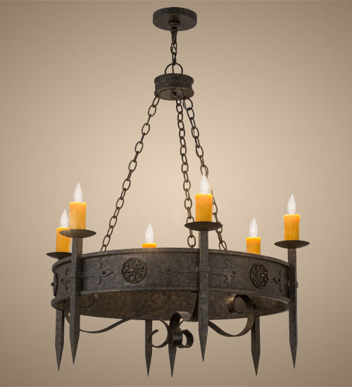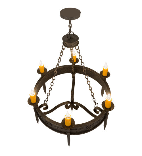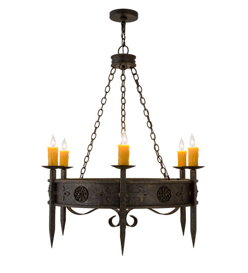 Calandara integrates a rich charm and artistic look. Floral medallions accentuate this stunning steel chandelier, which is adorned with six exquisite faux candlelights perched on bobeches with Gothic styled spears. The fixture is enhanced with sturdy, detailed hardware and a scrolled finial featured in a handsome Golden Bronze finish. The fixture is ideal for entryways, dining areas, and other rooms in a variety of residential and commercial settings. The chandelier is handcrafted by our artisans in the USA. Options include dimmable energy efficient lamping, as well as custom sizes, styles and colors. The fixture is UL and cUL listed for damp and dry locations.