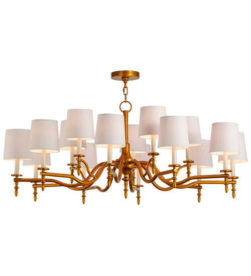 Classic American beauty comes to light with this elaborate chandelier adorned with 15 Cream colored Textrene shades that top candlelights attached to delicate bobeches and curved arms finished in a luxurious Brass Tint. An elegant design statement with a sophisticated look. This chandelier is handcrafted by highly skilled artisans in our 180,000 square foot manufacturing facility in Yorkville, New York. Custom sizes, finishes and styles are offered. Dimmable energy efficient lamping options are available. UL and cUL listed for dry and damp locations however we do not recommend installing it in spaces that experience a large amount of moisture due to the fabric shades.