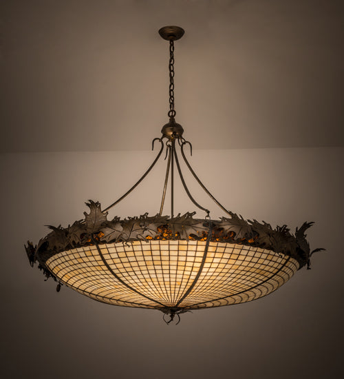 Majestic as the mighty oak is this leaf adorned inverted pendant in an antique copper finish. A lighted stained glass acorn, in Ivory with a multi-toned Bark Brown granite glass crown that sprouts oak leaf covered hardware that is hand made in the USA by Meyda Tiffany craftsmen.