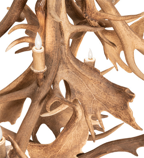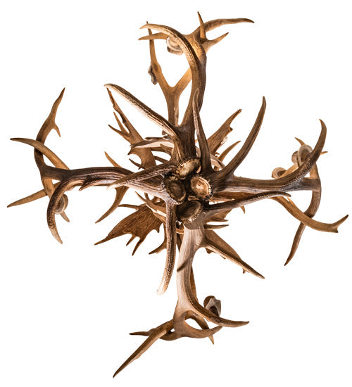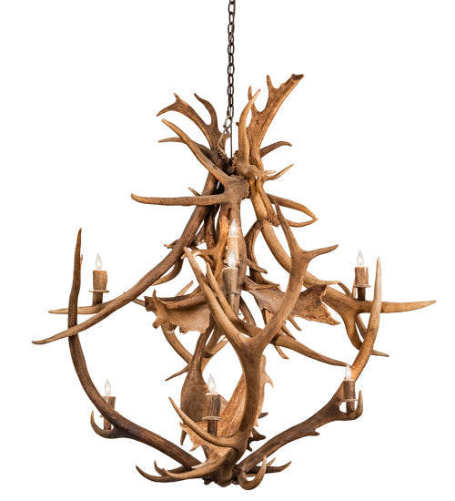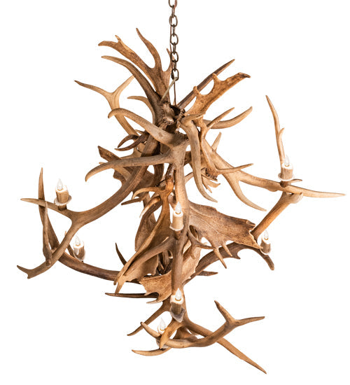 Dramatic wildlife designs come to light. Capture the rustic charm of Naturally shed, hand selected Antlers from Elk and Fallow Deer. No animals are harmed and all antlers are 100 percent authentic. This chandelier is adorned with 10 complementary faux candlelights and are complemented with a Mahogany Bronze finish.