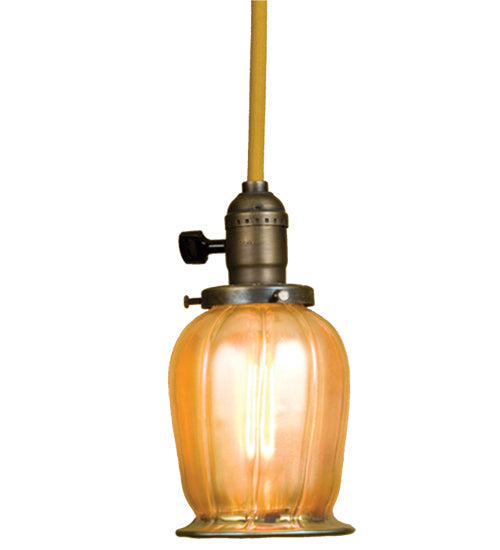An era of style and elegance is restored with this early electric reproduction Chelsea mini pendant with a beautiful squash shaped iridescent Favrile glass shade. The handsome cloth covered wire paddle switch fixture is crafted from brass in the USA by Meyda artisans and hand finished in Antique Brass with a Gold cord cover.