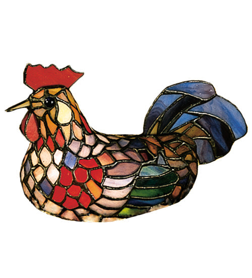Like a waking sound at the break of day, this charming lighted Tiffany-styled Rooster sculpture appears to be preparing to crow. This accent lamp will enhance your shelf or over the mantle-the perfect gift or decorative accessory. The Rooster is featured in multicolored glass with a Red Comb and Blue Tail- the piece is handcrafted using the famous Meyda Tiffany copperfoil construction process. The Rooster Accent Lamp is included in our American-designed, handcrafted Stained Glass Lighting Collection. UL and cUL listed for dry locations. Each lighted sculpture is a unique work of art with color variations based on natural ingredients inherent in the glass.