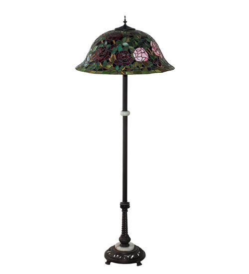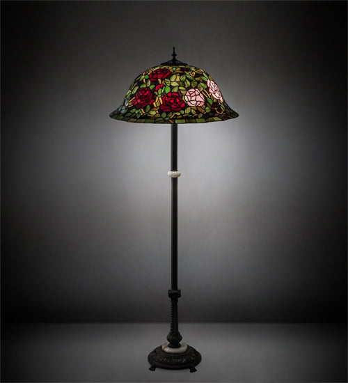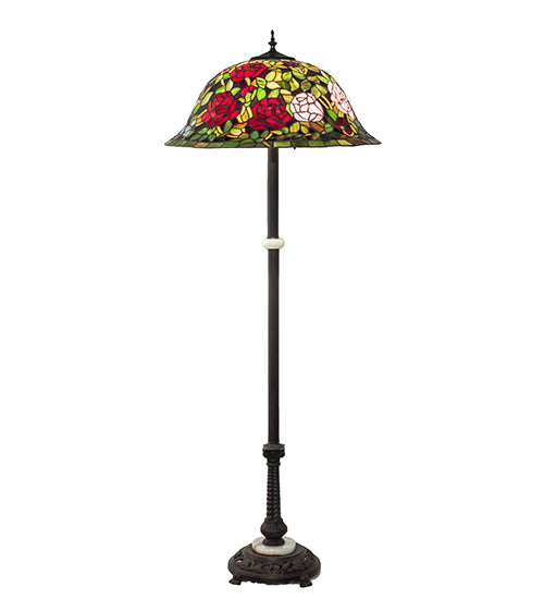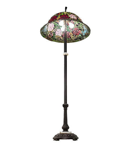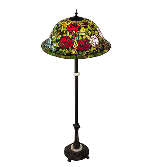 The most beloved of all floral beauties. The Rosebush is beautifully represented in this stunning reproduction of a Tiffany Studio Classic. Petal Pink; Romantic Red and Beautiful Blue art glass Roses ramble on a maze of Garden Green leaves. The shade is created using the famous Meyda Lighting Tiffany copperfoil construction. The delicate domed stained glass shade is paired with a Mahogany Bronze finished floor base. UL and cUL listed for dry locations.