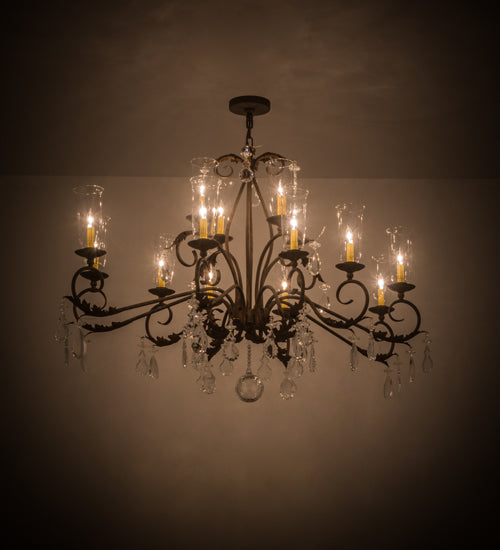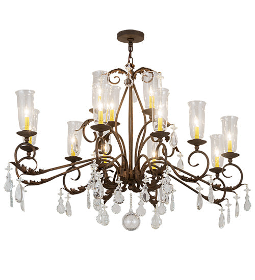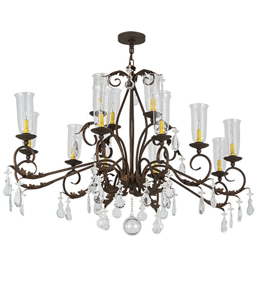 Inspired by the beauty and grace of ballrooms in renowned castles and mansions spanning the globe, Windsor features 14 Clear Glass Hurricane styled shades that reveal Ivory faux candle lights. The elegant shades are embraced by bobeches with Acanthus Leaf Accents and Crystal Glass Pendalogs and Orb on a frame with hardware featured in a Gilded Tobacco finish.