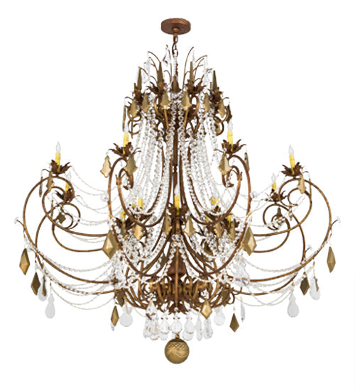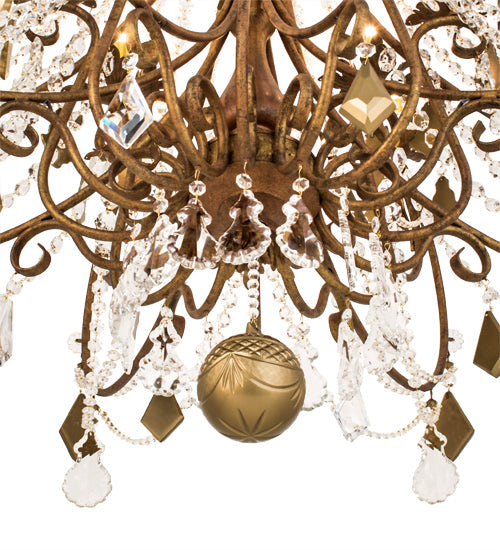 An elaborate, elegant chandelier design comes to light with sparkle and glamor. Exquisite Clear Crystal and Gold Opaque Crystal droplets complement 16 faux Amber candlelights perched on fanciful bobeches embraced by exquisite scrolled arms. Matching Acanthus leaf accents are featured in an Autumn Leaf finish.