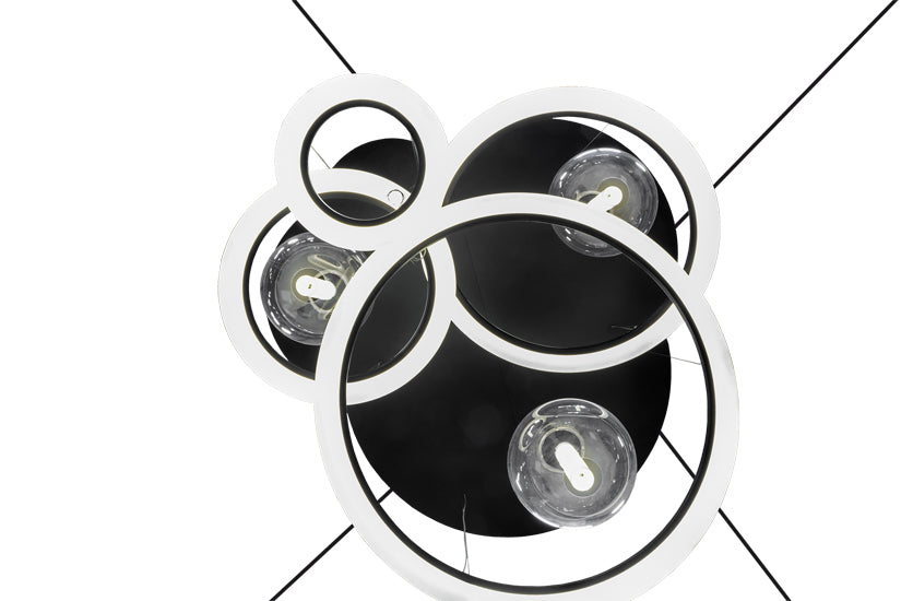 Modern sophisticated system featuring extraordinary elements of light. Ecliptic Crystal Idalight rings illuminate around satellite orbs appearing to float in space with a dramatic interplay of light and shadow. Supported by sturdy aircraft cables to Solar Black finished cloud canopy.