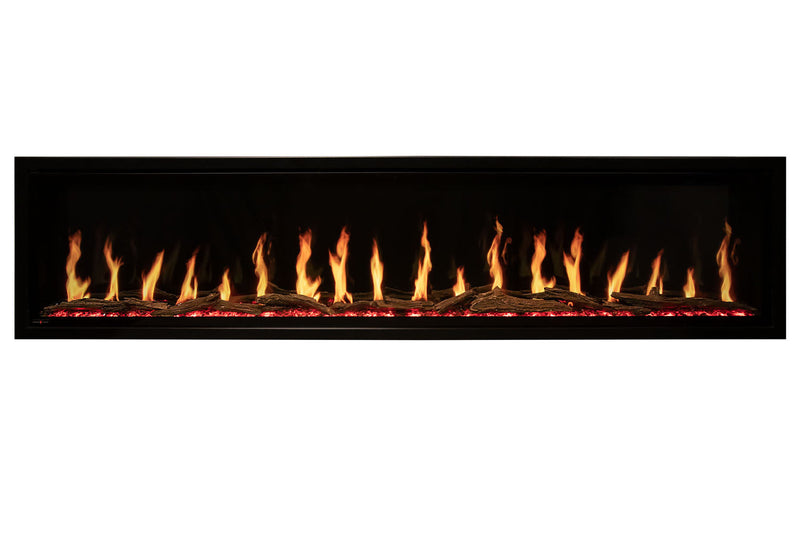Modern Flames Orion Slim Heliovision Virtual Electric Fireplace brings undistracted lifelike flame appearance and functionality to any space. The Orion Slim Virtual fireplace creates the most realistic virtual multi-dimensional fire with the new HELIOVISION™ Flame Technology. The tinted front glass and 15" high viewing area allow seeing all the beauty of the dancing flames. Unit comes with two standard ember bed options: western driftwood log set and black reflective crushed glass media. Create a unique artificial fire display with three stunning flame styles: wood-burning fire with sparks; gas burning like fire or hybrid mixed flames: wood-burning and gas fire. Enjoy six flame color options: yellow, blue, green, orange, purple, and white. Multicolored ember bed lighting provides a truly customizable experience. For even more ambiance, switch on the fire-cracking sounds and relax.