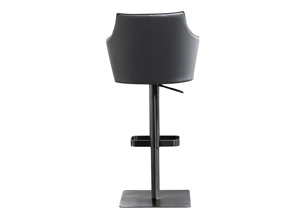 Baxter Barstool, Front in Light Grey Faux Leather, Back in Dark Grey Faux Leather, Adjustable Height with Gas lift, Swivel Base in Brushed Silver Stainless Steel.