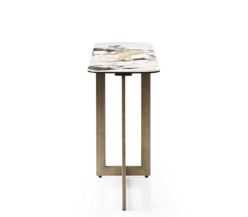 Nola Console, 6mm Glass and 6mm White Ceramic Top, Brushed Bronze Steel Base.