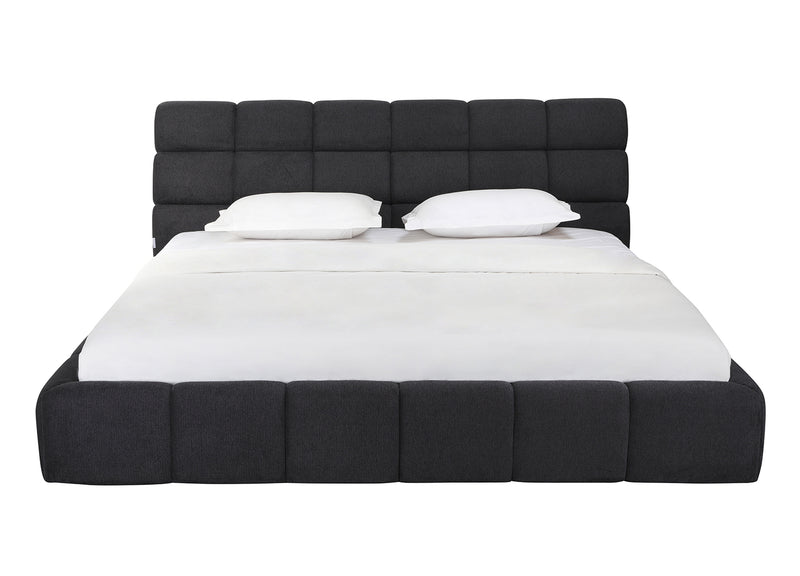 Owen Bed King, Fully Upholstered, Dark Grey Fabric, Head – board and Base in Padded Squares Design.