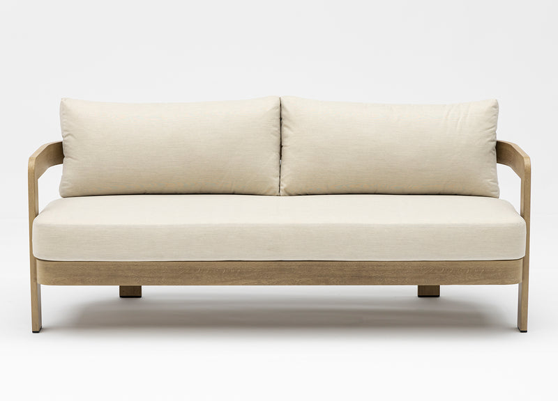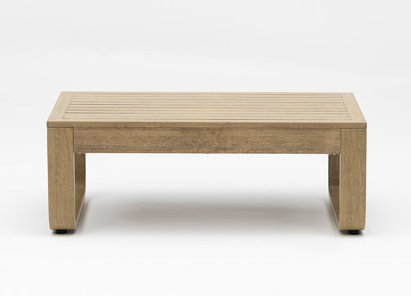 Sally Outdoor Collection, 4 Pieces: One Love Seat, Two Single Chairs and Coffee Table. Structure and Base in Aluminum with Wood Finish. Seat and Back Cushions in Beige Fabric.