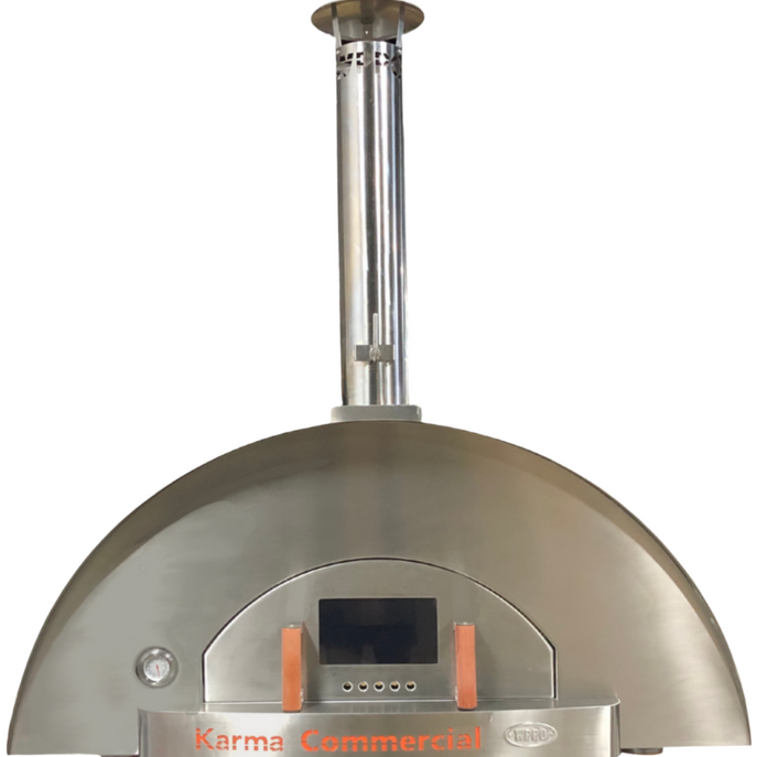 This WKK-04COM Karma 55 industrial stainless steel wood fire pizza oven will take your wood fire cooking to the next level! This oven cooks food rapidly while maintaining nutritional quality, allowing you to add smoky wood tastes to your pizzas, meats, and vegetables. The smoke passes effortlessly through a vertical design to infuse whatever is cooking, whether it's baking or roasting. Furthermore, this large pizza oven has the ability to handle up to five pizzas at once!