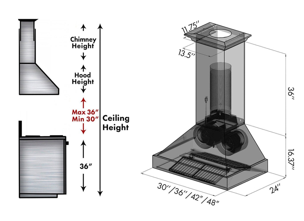 • Chimney: 13.5" W x 11.75" D x 36" H - Fits ceilings up to 10 ft. Must custom cut.
